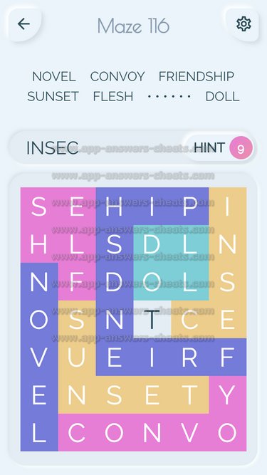 Word Maze Level 116 Answer, Cheat and Solution is online and available for this superb new word game created by Second Gear Games and compatible with Android, iPhone & iPad devices. You have to search all words with sliding over your screen. It’s a lovely game but sometimes you get stuck, that’s why we offer you help to solve all levels. Good luck and have fun. Thanks for your visit.