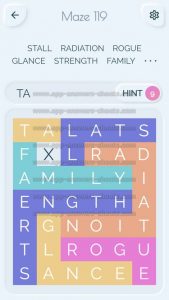 Word Maze Level 119 Answer, Cheat and Solution is online and available for this superb new word game created by Second Gear Games and compatible with Android, iPhone & iPad devices. You have to search all words with sliding over your screen. It’s a lovely game but sometimes you get stuck, that’s why we offer you help to solve all levels. Good luck and have fun. Thanks for your visit.