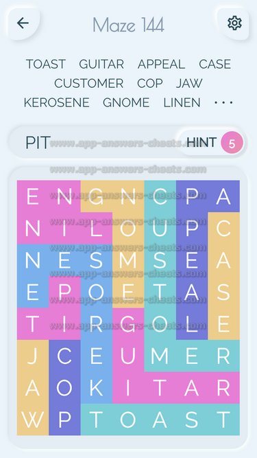 Word Maze Level 144 Answer, Cheat and Solution is online and available for this superb new word game created by Second Gear Games and compatible with Android, iPhone & iPad devices. You have to search all words with sliding over your screen. It’s a lovely game but sometimes you get stuck, that’s why we offer you help to solve all levels. Good luck and have fun. Thanks for your visit.