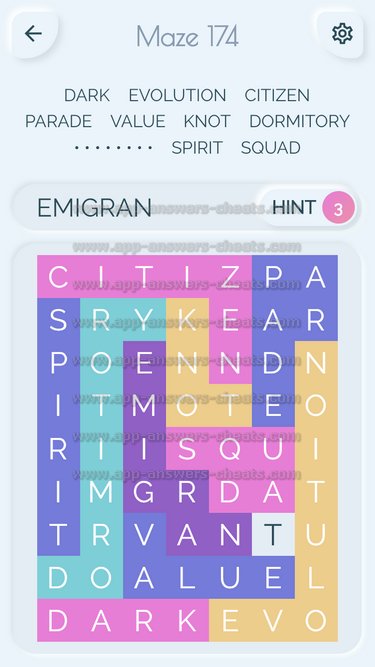 Word Maze Level 174 Answer, Cheat and Solution is online and available for this superb new word game created by Second Gear Games and compatible with Android, iPhone & iPad devices. You have to search all words with sliding over your screen. It’s a lovely game but sometimes you get stuck, that’s why we offer you help to solve all levels. Good luck and have fun. Thanks for your visit.