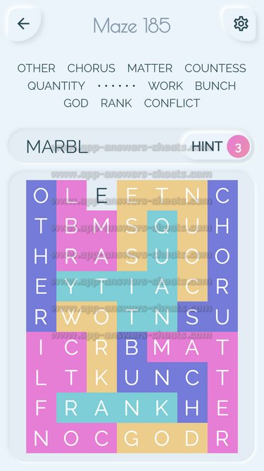 Word Maze Level 185 Answer, Cheat and Solution is online and available for this superb new word game created by Second Gear Games and compatible with Android, iPhone & iPad devices. You have to search all words with sliding over your screen. It’s a lovely game but sometimes you get stuck, that’s why we offer you help to solve all levels. Good luck and have fun. Thanks for your visit.