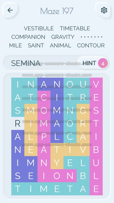 Word Maze Level 197 Answer, Cheat and Solution is online and available for this superb new word game created by Second Gear Games and compatible with Android, iPhone & iPad devices. You have to search all words with sliding over your screen. It’s a lovely game but sometimes you get stuck, that’s why we offer you help to solve all levels. Good luck and have fun. Thanks for your visit.