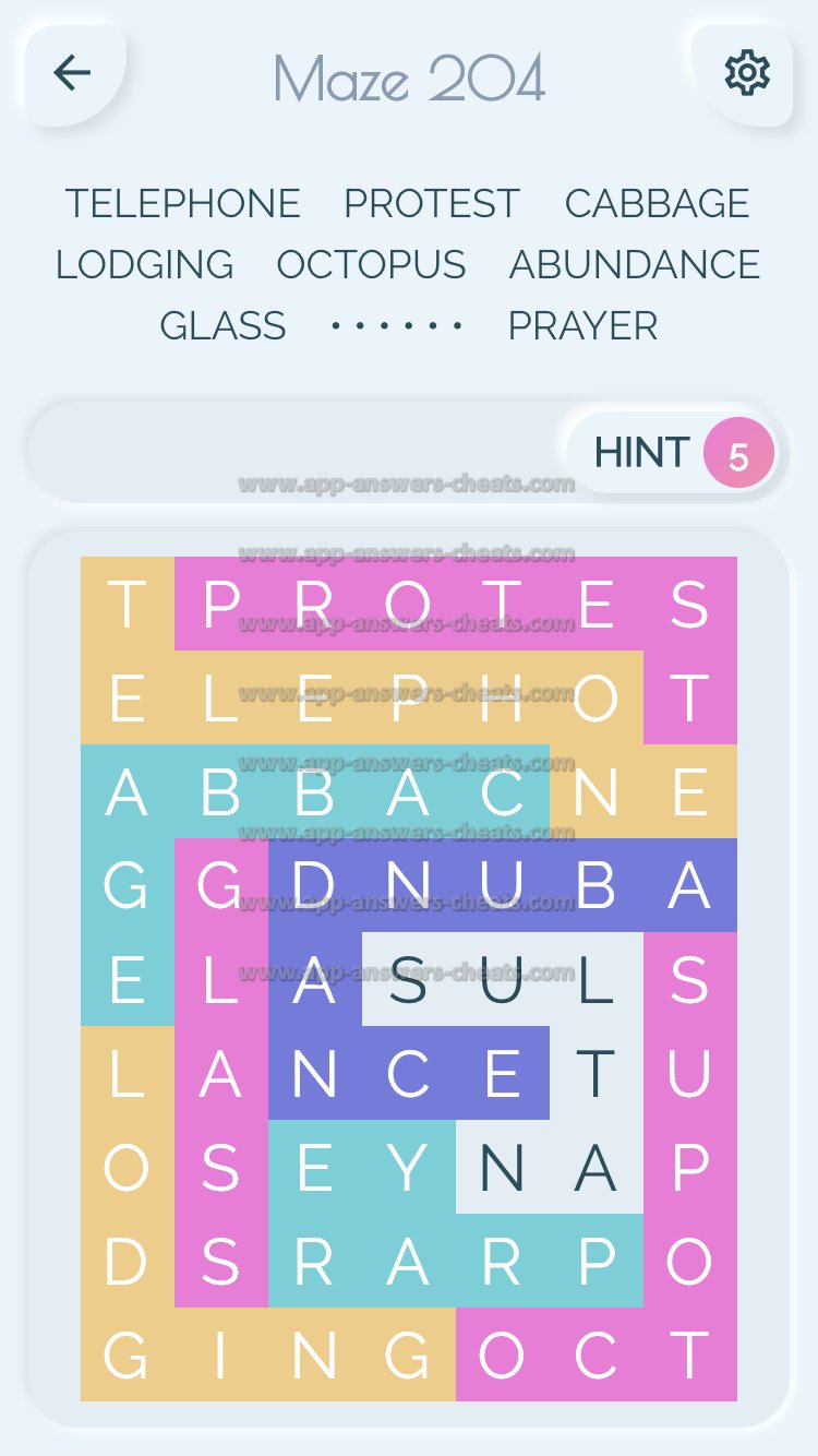 Word Maze Level 204 Answer, Cheat and Solution is online and available for this superb new word game created by Second Gear Games and compatible with Android, iPhone & iPad devices. You have to search all words with sliding over your screen. It’s a lovely game but sometimes you get stuck, that’s why we offer you help to solve all levels. Good luck and have fun. Thanks for your visit.