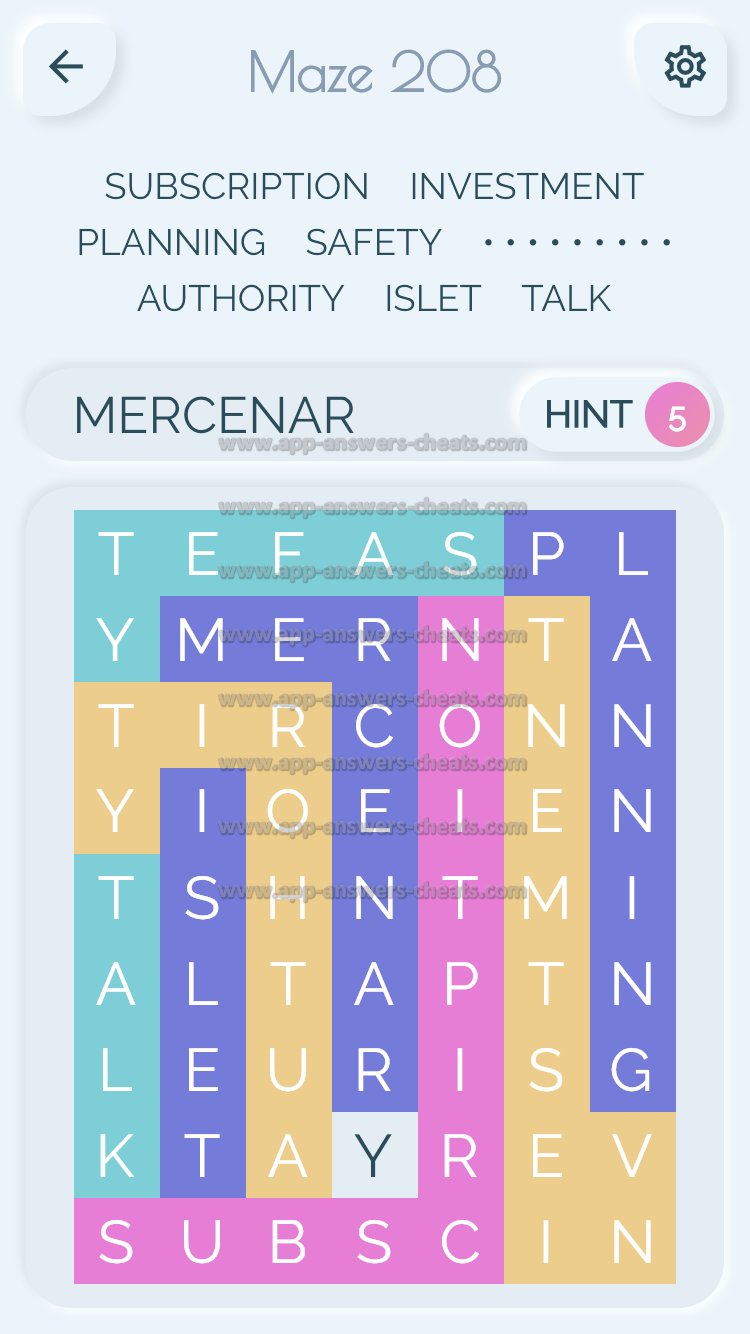 Word Maze Level 208 Answer, Cheat and Solution is online and available for this superb new word game created by Second Gear Games and compatible with Android, iPhone & iPad devices. You have to search all words with sliding over your screen. It’s a lovely game but sometimes you get stuck, that’s why we offer you help to solve all levels. Good luck and have fun. Thanks for your visit.