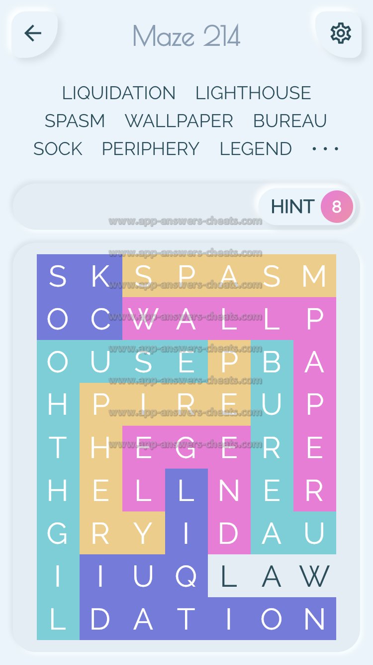 Word Maze Level 214 Answer, Cheat and Solution is online and available for this superb new word game created by Second Gear Games and compatible with Android, iPhone & iPad devices. You have to search all words with sliding over your screen. It’s a lovely game but sometimes you get stuck, that’s why we offer you help to solve all levels. Good luck and have fun. Thanks for your visit.