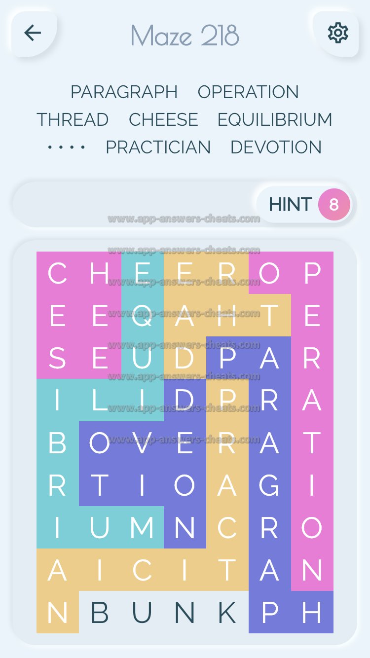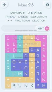 Word Maze Level 218 Answer, Cheat and Solution is online and available for this superb new word game created by Second Gear Games and compatible with Android, iPhone & iPad devices. You have to search all words with sliding over your screen. It’s a lovely game but sometimes you get stuck, that’s why we offer you help to solve all levels. Good luck and have fun. Thanks for your visit.