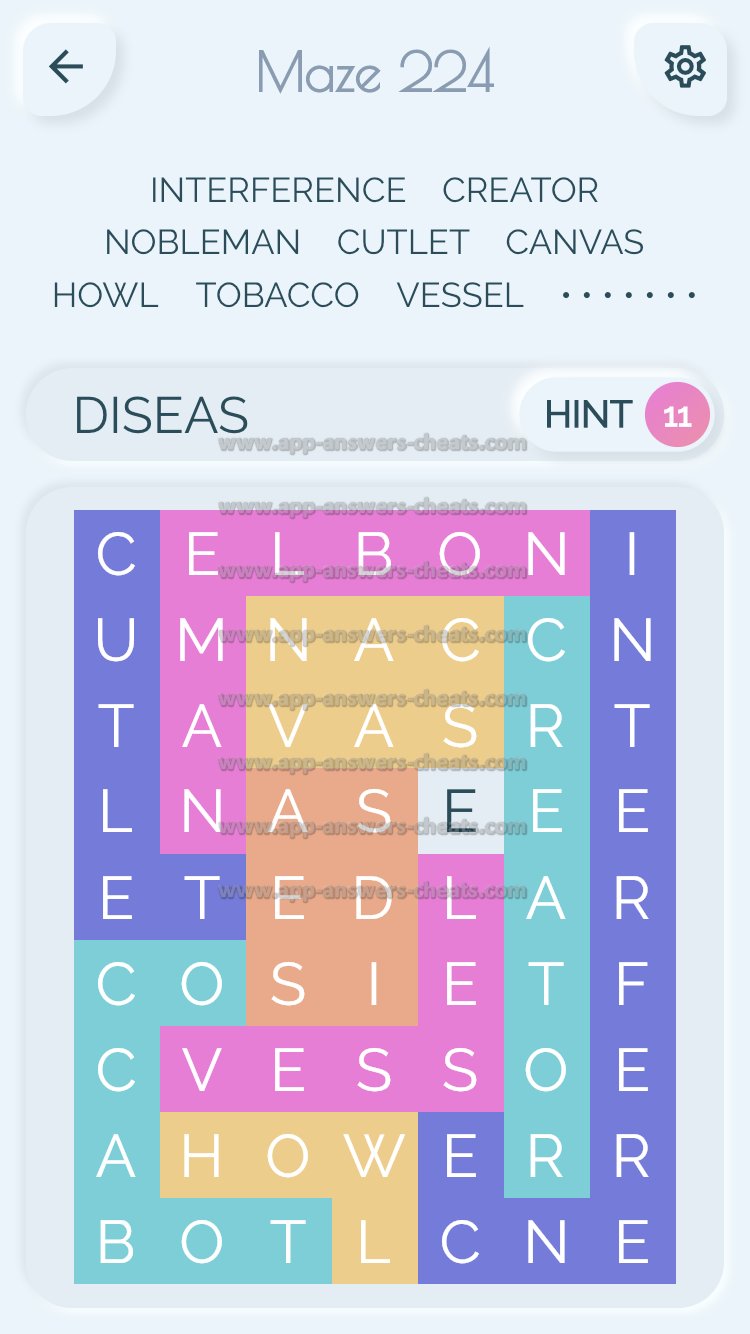Word Maze Level 224 Answer, Cheat and Solution is online and available for this superb new word game created by Second Gear Games and compatible with Android, iPhone & iPad devices. You have to search all words with sliding over your screen. It’s a lovely game but sometimes you get stuck, that’s why we offer you help to solve all levels. Good luck and have fun. Thanks for your visit.