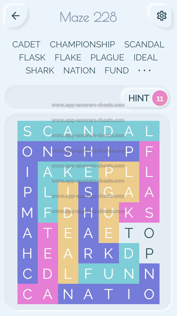 Word Maze Level 228 Answer, Cheat and Solution is online and available for this superb new word game created by Second Gear Games and compatible with Android, iPhone & iPad devices. You have to search all words with sliding over your screen. It’s a lovely game but sometimes you get stuck, that’s why we offer you help to solve all levels. Good luck and have fun. Thanks for your visit.