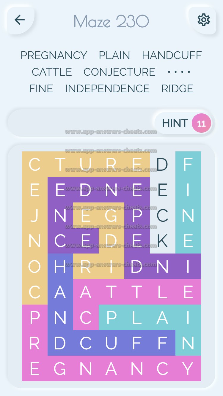 Word Maze Level 230 Answer, Cheat and Solution is online and available for this superb new word game created by Second Gear Games and compatible with Android, iPhone & iPad devices. You have to search all words with sliding over your screen. It’s a lovely game but sometimes you get stuck, that’s why we offer you help to solve all levels. Good luck and have fun. Thanks for your visit.
