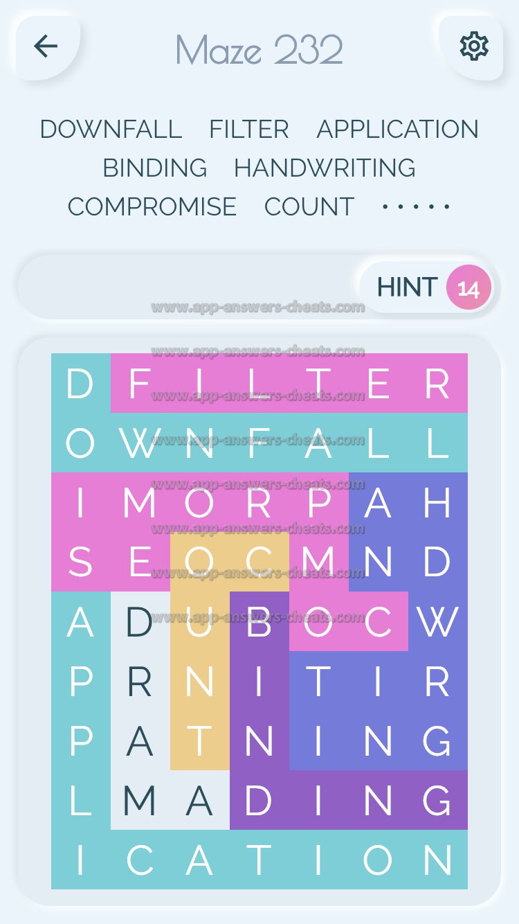 Word Maze Level 232 Answer, Cheat and Solution is online and available for this superb new word game created by Second Gear Games and compatible with Android, iPhone & iPad devices. You have to search all words with sliding over your screen. It’s a lovely game but sometimes you get stuck, that’s why we offer you help to solve all levels. Good luck and have fun. Thanks for your visit.