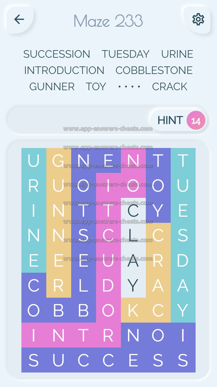 Word Maze Level 233 Answer, Cheat and Solution is online and available for this superb new word game created by Second Gear Games and compatible with Android, iPhone & iPad devices. You have to search all words with sliding over your screen. It’s a lovely game but sometimes you get stuck, that’s why we offer you help to solve all levels. Good luck and have fun. Thanks for your visit.