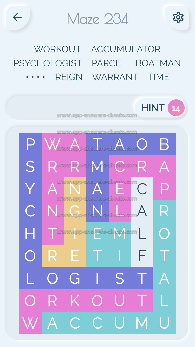 Word Maze Level 234 Answer, Cheat and Solution is online and available for this superb new word game created by Second Gear Games and compatible with Android, iPhone & iPad devices. You have to search all words with sliding over your screen. It’s a lovely game but sometimes you get stuck, that’s why we offer you help to solve all levels. Good luck and have fun. Thanks for your visit.