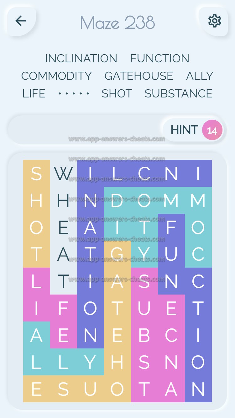 Word Maze Level 238 Answer, Cheat and Solution is online and available for this superb new word game created by Second Gear Games and compatible with Android, iPhone & iPad devices. You have to search all words with sliding over your screen. It’s a lovely game but sometimes you get stuck, that’s why we offer you help to solve all levels. Good luck and have fun. Thanks for your visit.