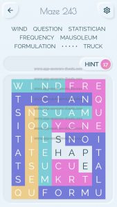 Word Maze Level 243 Answer, Cheat and Solution is online and available for this superb new word game created by Second Gear Games and compatible with Android, iPhone & iPad devices. You have to search all words with sliding over your screen. It’s a lovely game but sometimes you get stuck, that’s why we offer you help to solve all levels. Good luck and have fun. Thanks for your visit.
