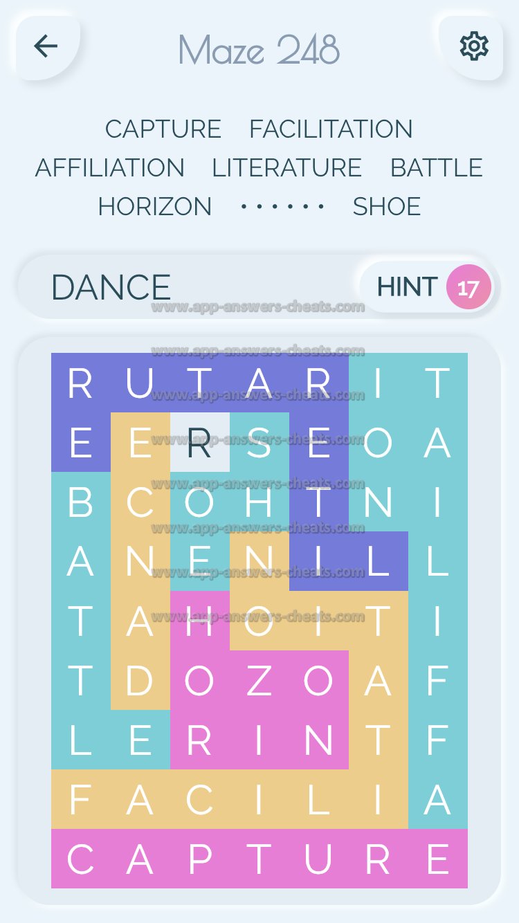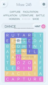 Word Maze Level 248 Answer, Cheat and Solution is online and available for this superb new word game created by Second Gear Games and compatible with Android, iPhone & iPad devices. You have to search all words with sliding over your screen. It’s a lovely game but sometimes you get stuck, that’s why we offer you help to solve all levels. Good luck and have fun. Thanks for your visit.