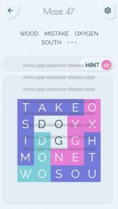 Word Maze Level 47 Answer, Cheat and Solution is online and available for this superb new word game created by Second Gear Games and compatible with Android, iPhone & iPad devices. You have to search all words with sliding over your screen. It’s a lovely game but sometimes you get stuck, that’s why we offer you help to solve all levels. Good luck and have fun. Thanks for your visit.