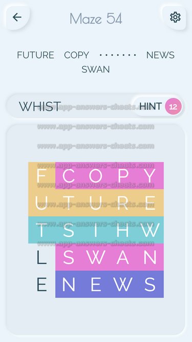 Word Maze Level 54 Answer, Cheat and Solution is online and available for this superb new word game created by Second Gear Games and compatible with Android, iPhone & iPad devices. You have to search all words with sliding over your screen. It’s a lovely game but sometimes you get stuck, that’s why we offer you help to solve all levels. Good luck and have fun. Thanks for your visit.