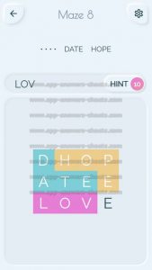 Word Maze Level 8 Answer, Cheat and Solution is online and available for this superb new word game created by Second Gear Games and compatible with Android, iPhone & iPad devices. You have to search all words with sliding over your screen. It’s a lovely game but sometimes you get stuck, that’s why we offer you help to solve all levels. Good luck and have fun. Thanks for your visit.