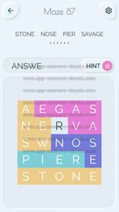 Word Maze Level 87 Answer, Cheat and Solution is online and available for this superb new word game created by Second Gear Games and compatible with Android, iPhone & iPad devices. You have to search all words with sliding over your screen. It’s a lovely game but sometimes you get stuck, that’s why we offer you help to solve all levels. Good luck and have fun. Thanks for your visit.