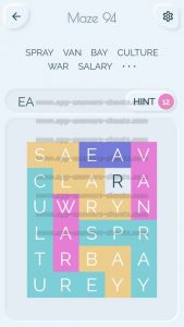 Word Maze Level 94 Answer, Cheat and Solution is online and available for this superb new word game created by Second Gear Games and compatible with Android, iPhone & iPad devices. You have to search all words with sliding over your screen. It’s a lovely game but sometimes you get stuck, that’s why we offer you help to solve all levels. Good luck and have fun. Thanks for your visit.